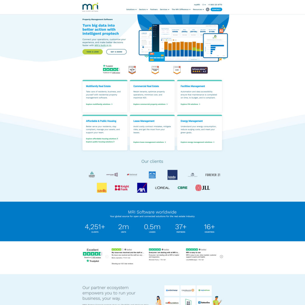 MRI Software has been building real estate technology since 1971. The open and connected ecosystem, built around the MIX API and modular design, is what differentiates it. Operators managing complex lease structures, CAM reconciliation, and mixed-use portfolios that combine residential and commercial assets find depth in MRI that residential-first platforms don’t have.