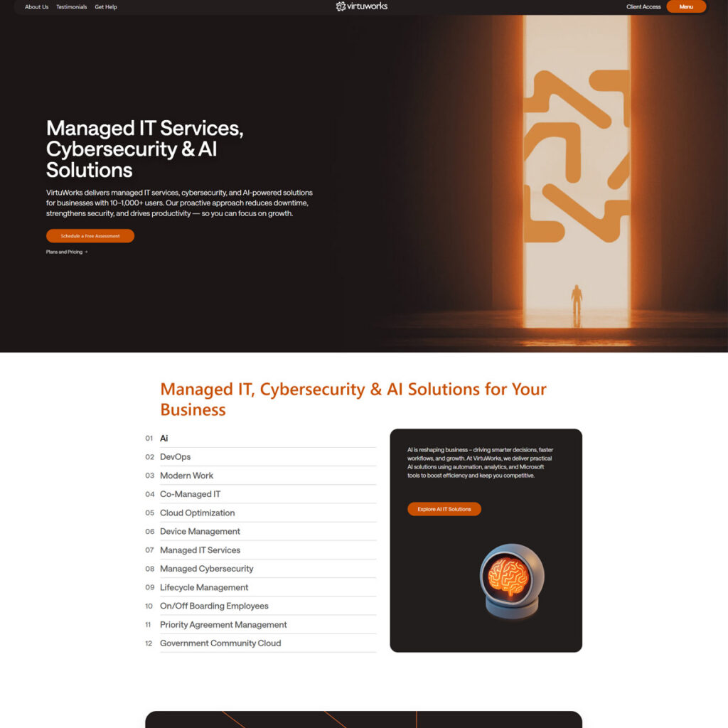 VirtuWorks provides managed IT support centered on cloud environments and operational continuity. Their services include hosting, backup, cybersecurity, and disaster recovery.